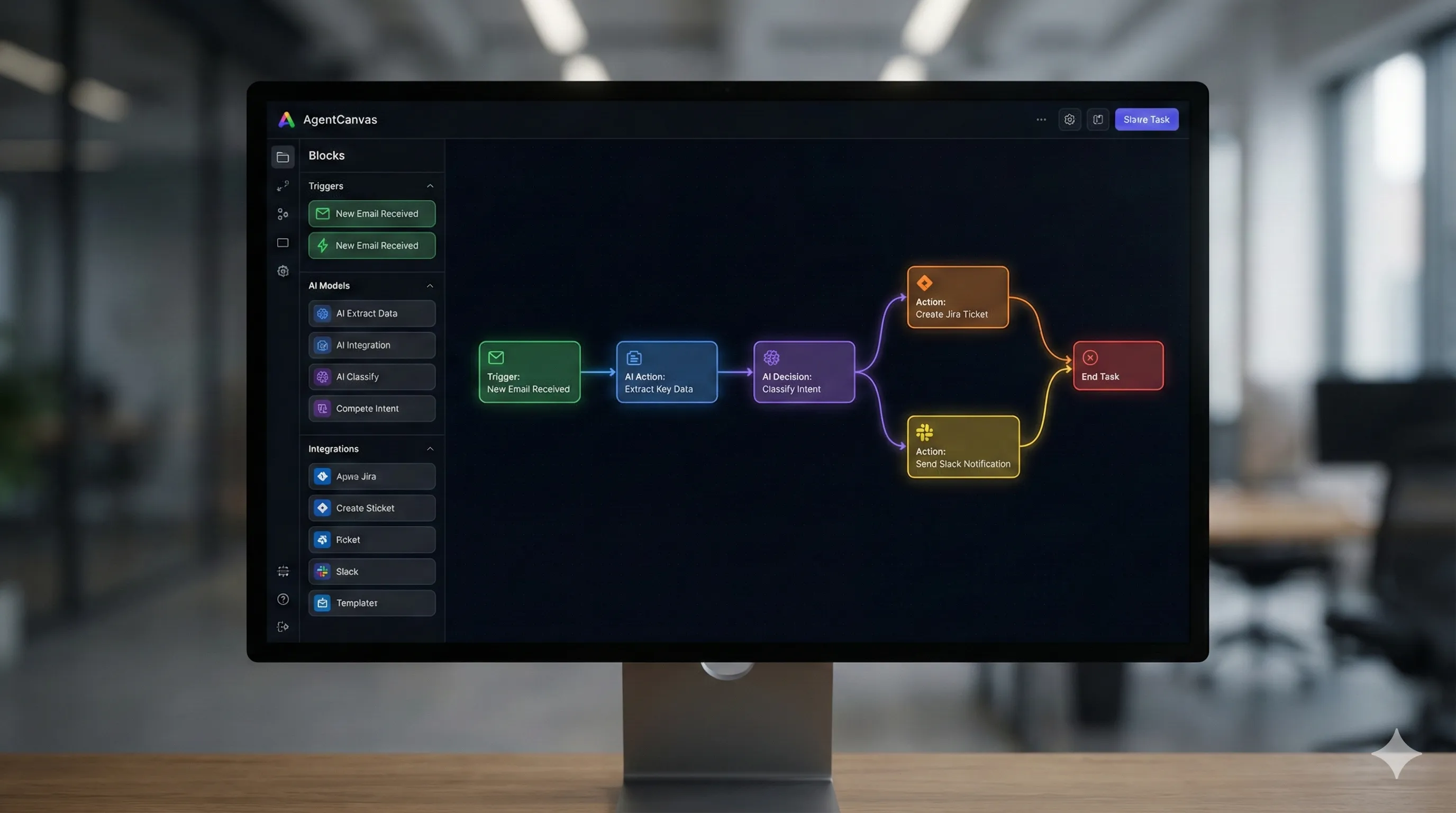 It allows non-technical users to build and deploy desktop agents via a drag-and-drop interface.