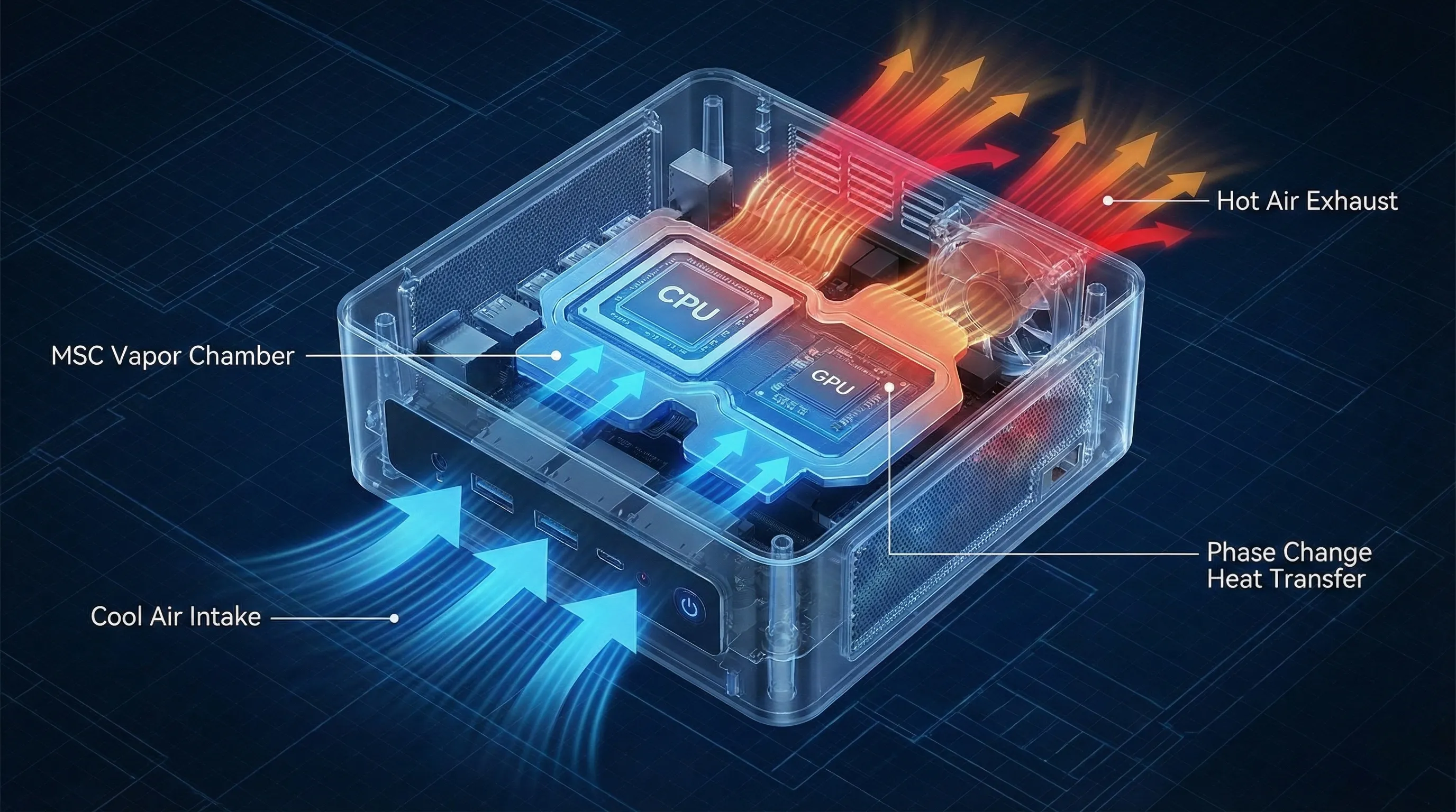 Packing 180W of performance into a 1-liter box requires futuristic cooling solutions.