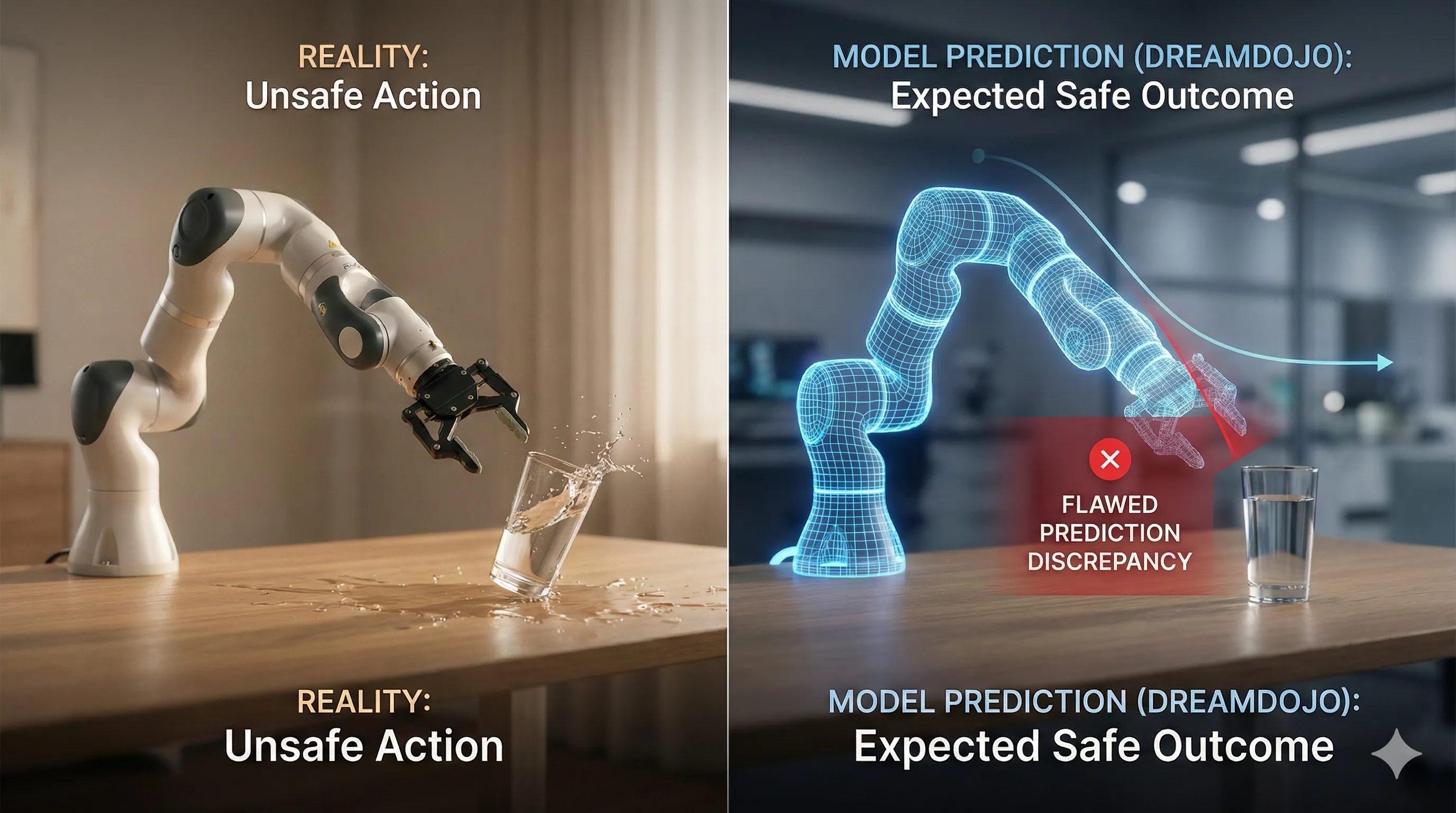 The world model's predictions are inherently imperfect, and the inherent gap between the diversity of human videos and the specific robot's morphology (its physical shape and capabilities) can lead to flawed plans. - Solution: