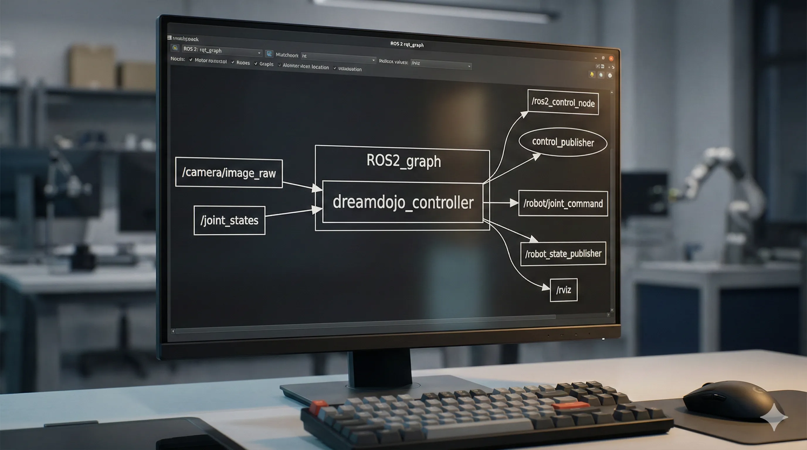 This decoupled architecture allows you to run the computationally intensive DreamDojo node on a powerful machine equipped with GPUs, while the robot's low-level controllers can operate on its integrated hardware or an embedded system.