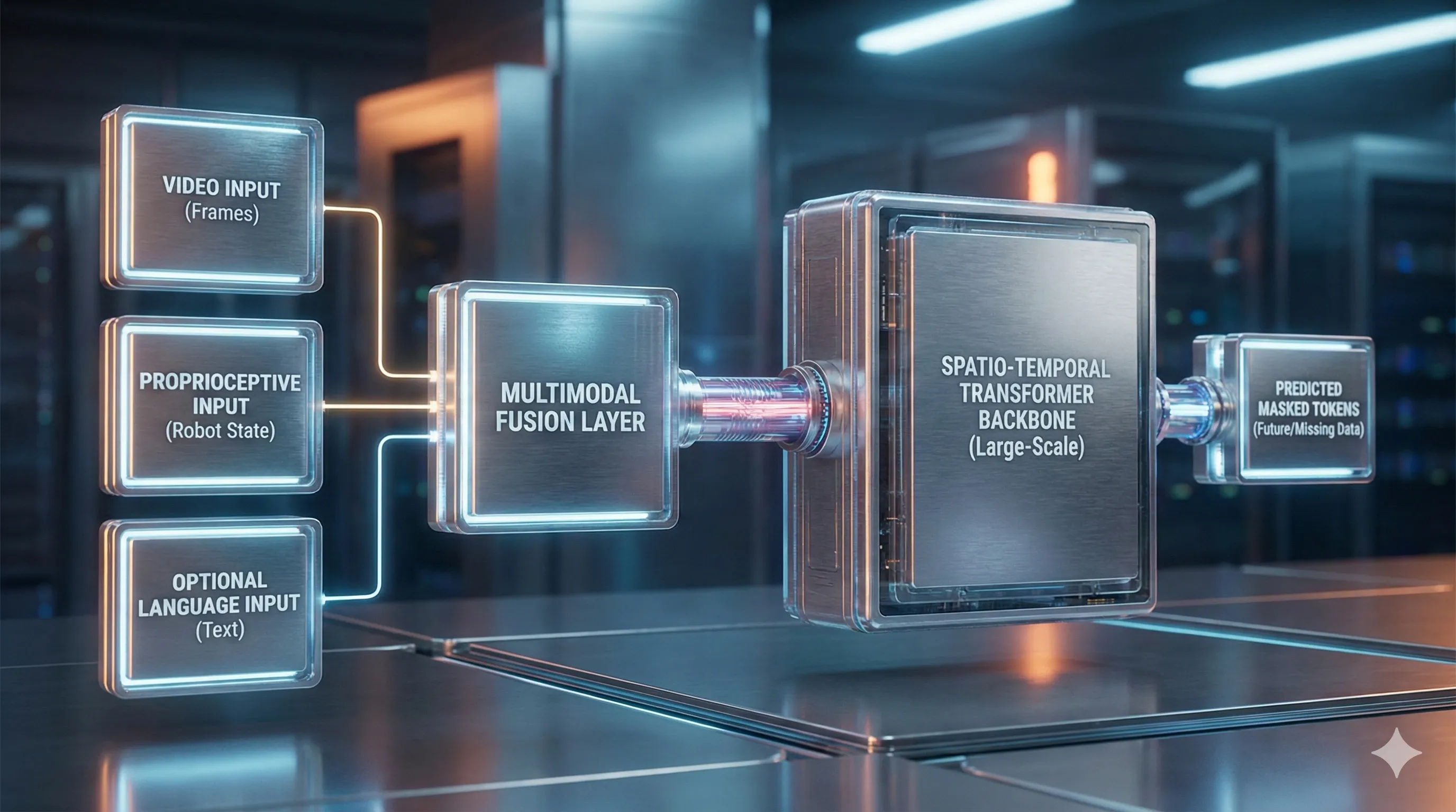 - Language Tokens (Optional): A text prompt detailing the goal (e.g., "pick up the red block") is encoded using a standard text encoder and treated as another sequence of tokens.