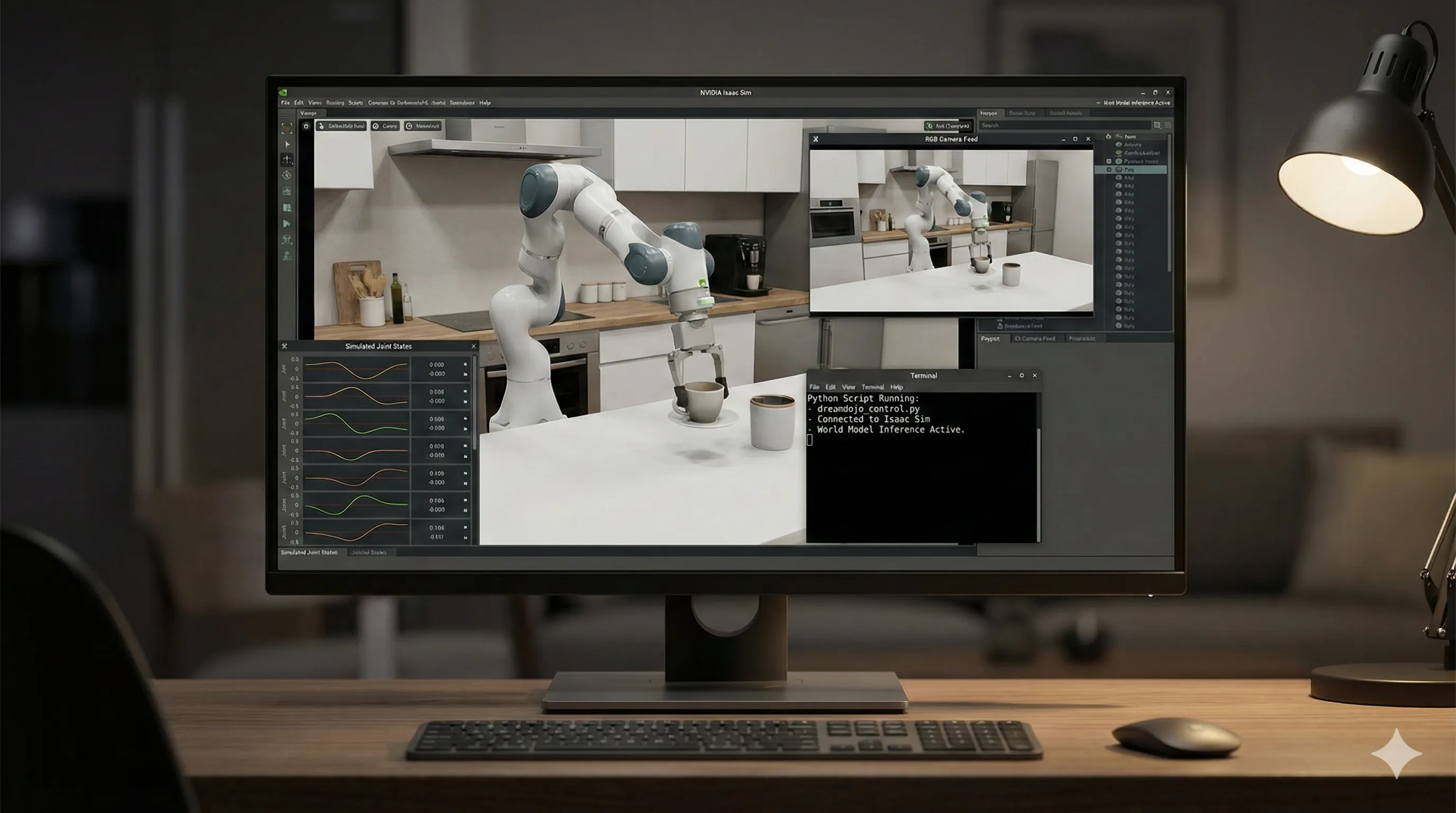 This script would retrieve observations (such as camera renders and current robot states) directly from the simulator. - These observations are then fed into the DreamDojo model.