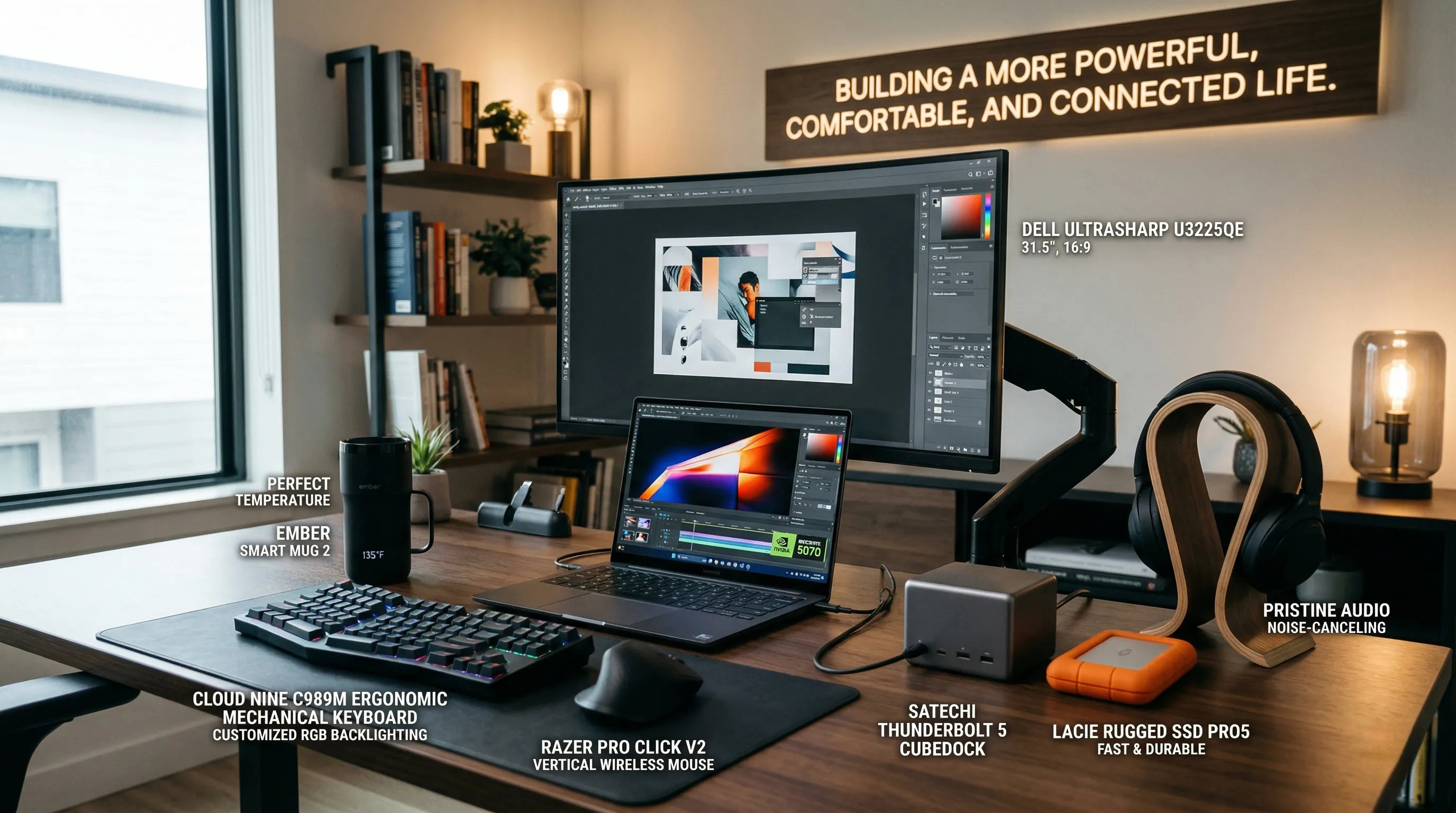Beyond pure performance, this lineup focuses on refined user experience and well-being. Immerse yourself in pristine audio with the Sony WH-1000XM6 noise-canceling headphones, designed for superior clarity and call quality. Combat fatigue with the ergonomic brilliance of the Razer Pro Click V2 Vertical Wireless Mouse and the customizable Cloud Nine C989M Ergonomic Mechanical Keyboard. Even your daily essentials are elevated, with the Ember Temperature Control Smart Mug 2 ensuring your coffee stays at the perfect temperature, and the LaCie Rugged SSD Pro5 offering unparalleled speed and durability for critical data. This collection isn't just about gadgets; it's about building a more powerful, comfortable, and connected life.