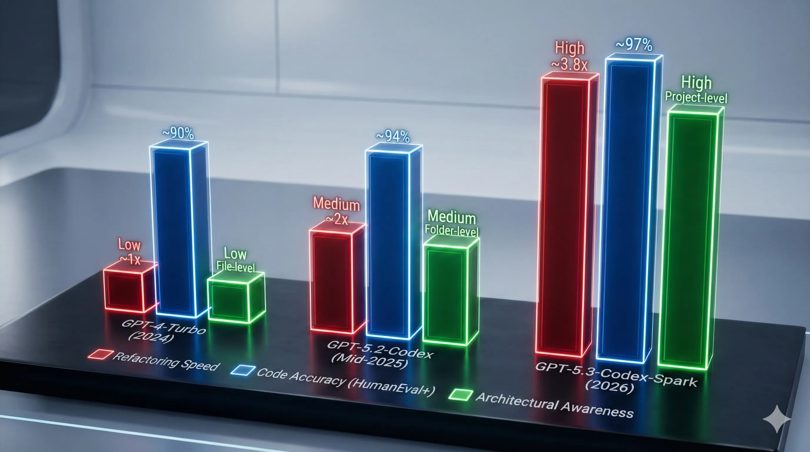 | Feature | GPT-4-Turbo (2024) | GPT-5.2-Codex (Mid-2025) | GPT-5.3-Codex-Spark (2026) |