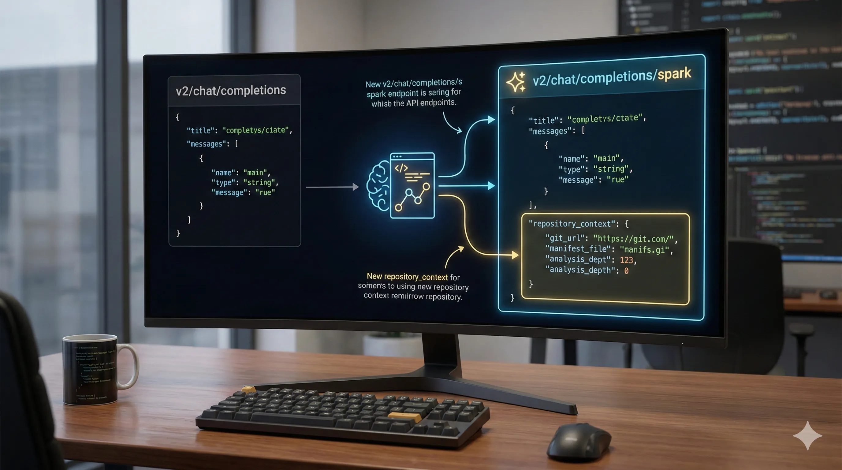 The repository-aware features are accessed via a new endpoint:v2/chat/completions/spark.