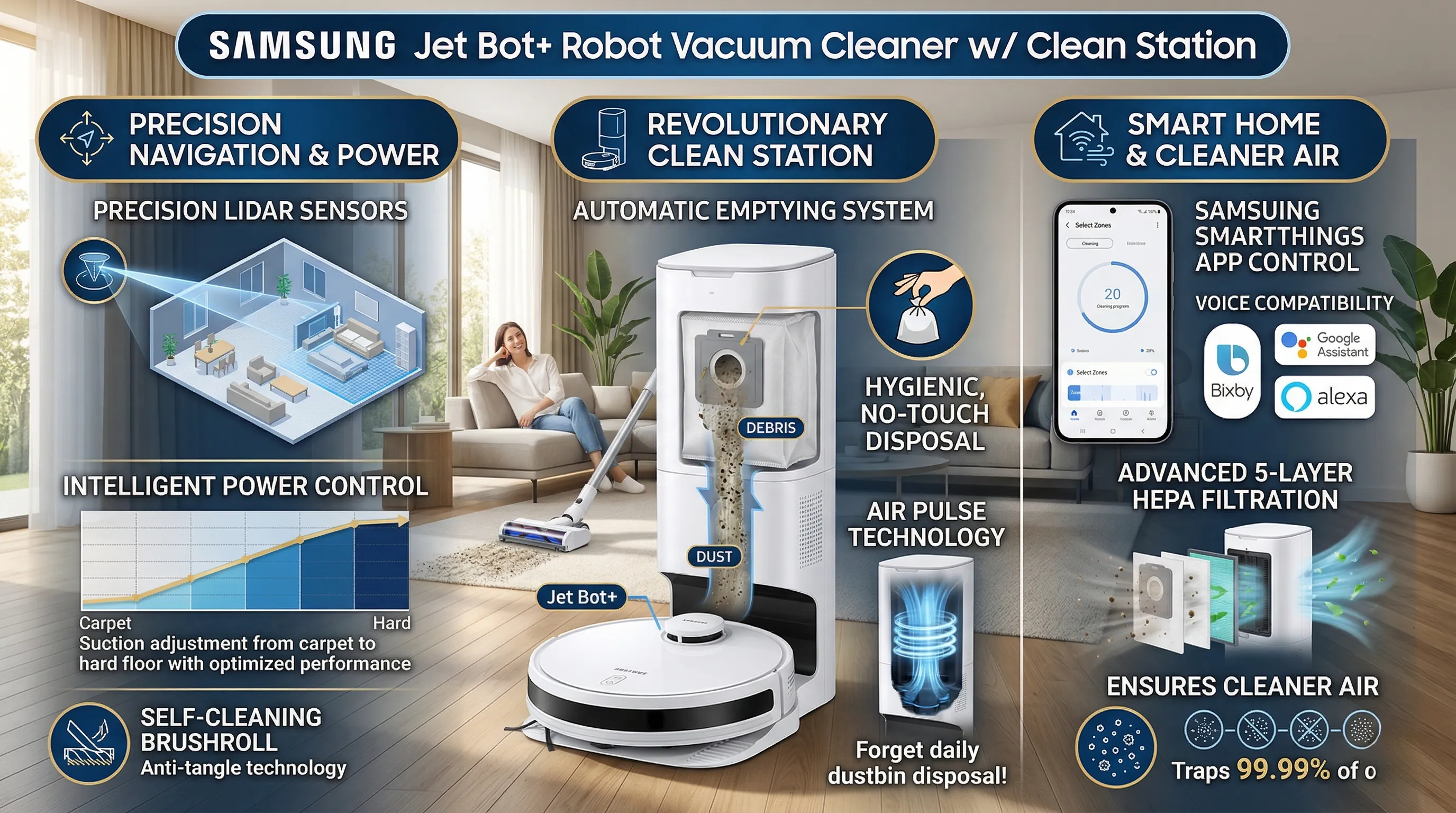 Beyond powerful cleaning, this device integrates seamlessly into your smart home ecosystem with Samsung SmartThings App control, voice compatibility with Bixby, Google Assistant, and Alexa, and a robust 5-layer HEPA filtration system to ensure cleaner air.