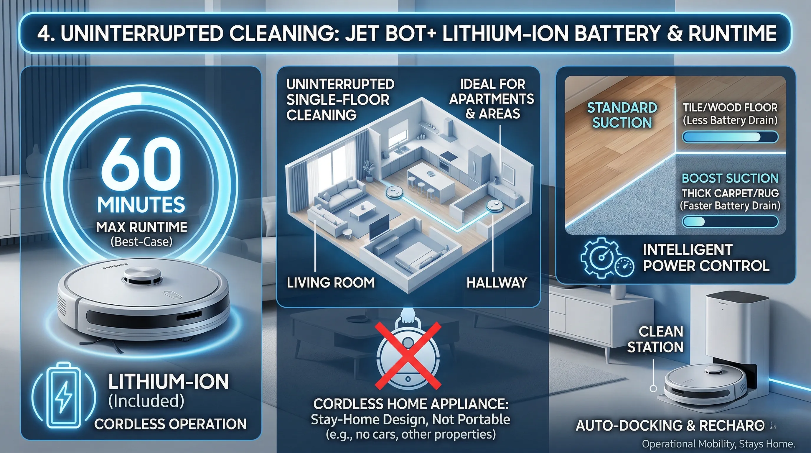 The Samsung Jet Bot+ operates untethered, powered by an internal Lithium-Ion battery.