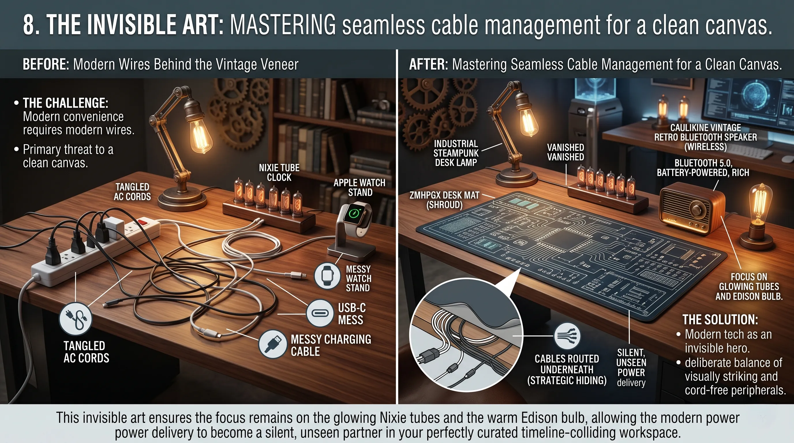 This invisible art ensures the focus remains on the glowing Nixie tubes and the warm Edison bulb, allowing the modern power delivery to become a silent, unseen partner in your perfectly curated timeline-colliding workspace.