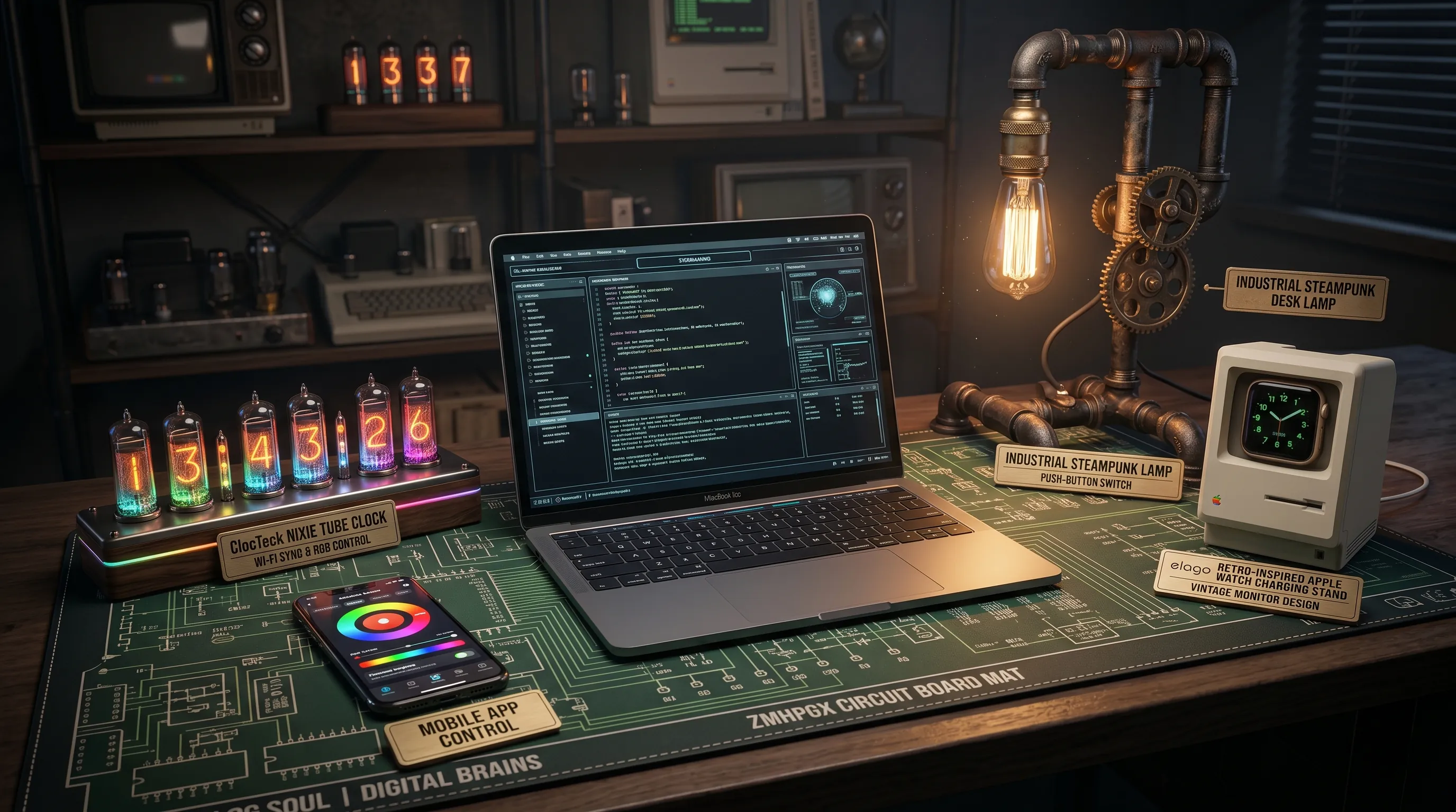 Use items like the circuit board mat or Nixie clock to create a cohesive theme that feels intentional and curated, ensuring your desk is a hub of high-powered productivity that just happens to look like it's from a beautifully imagined past.