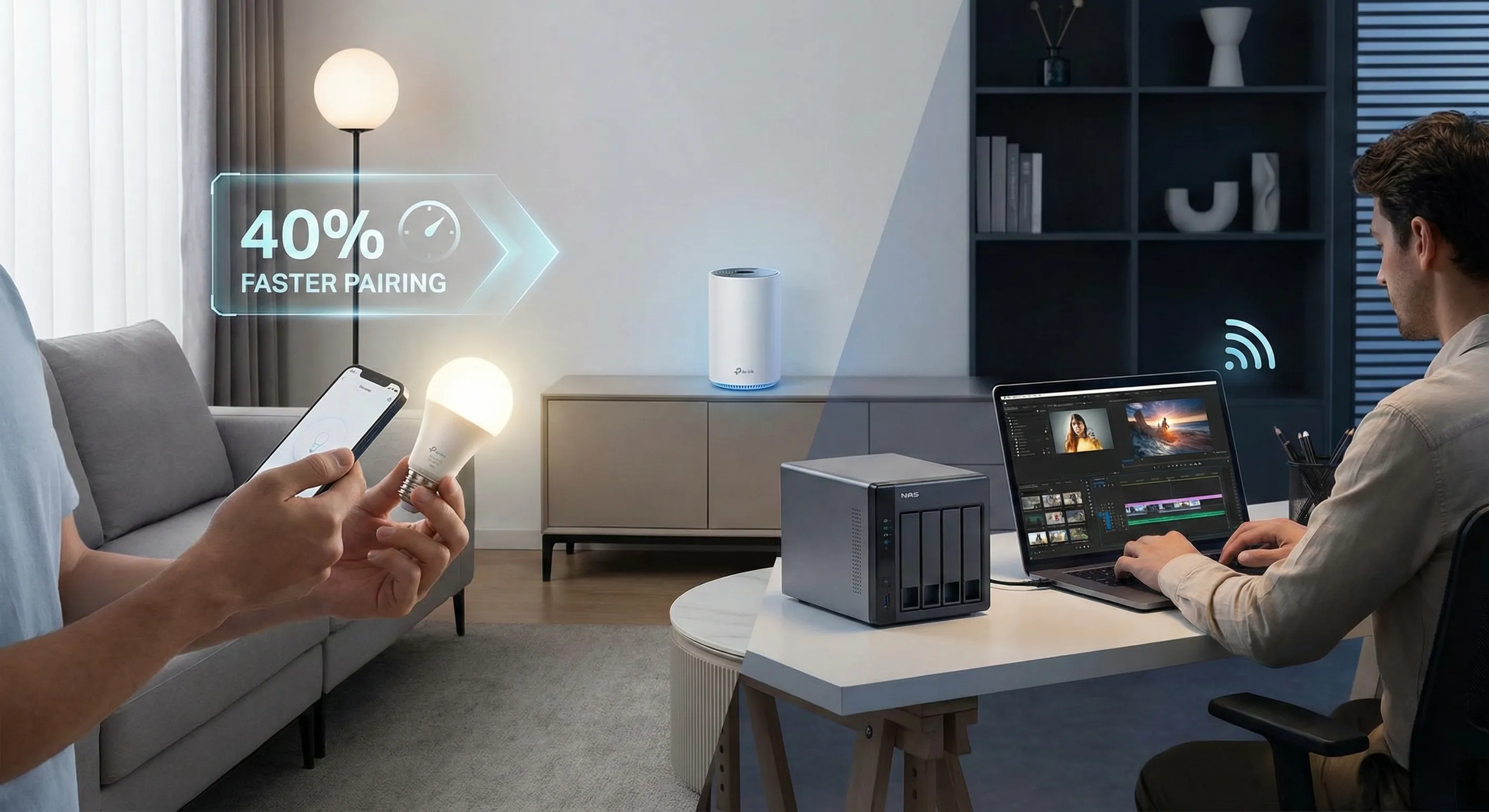This powerful capability facilitates 40% faster device pairing with popular platforms such as Philips Hue and Samsung SmartThings, significantly outperforming Wi-Fi 6 systems.