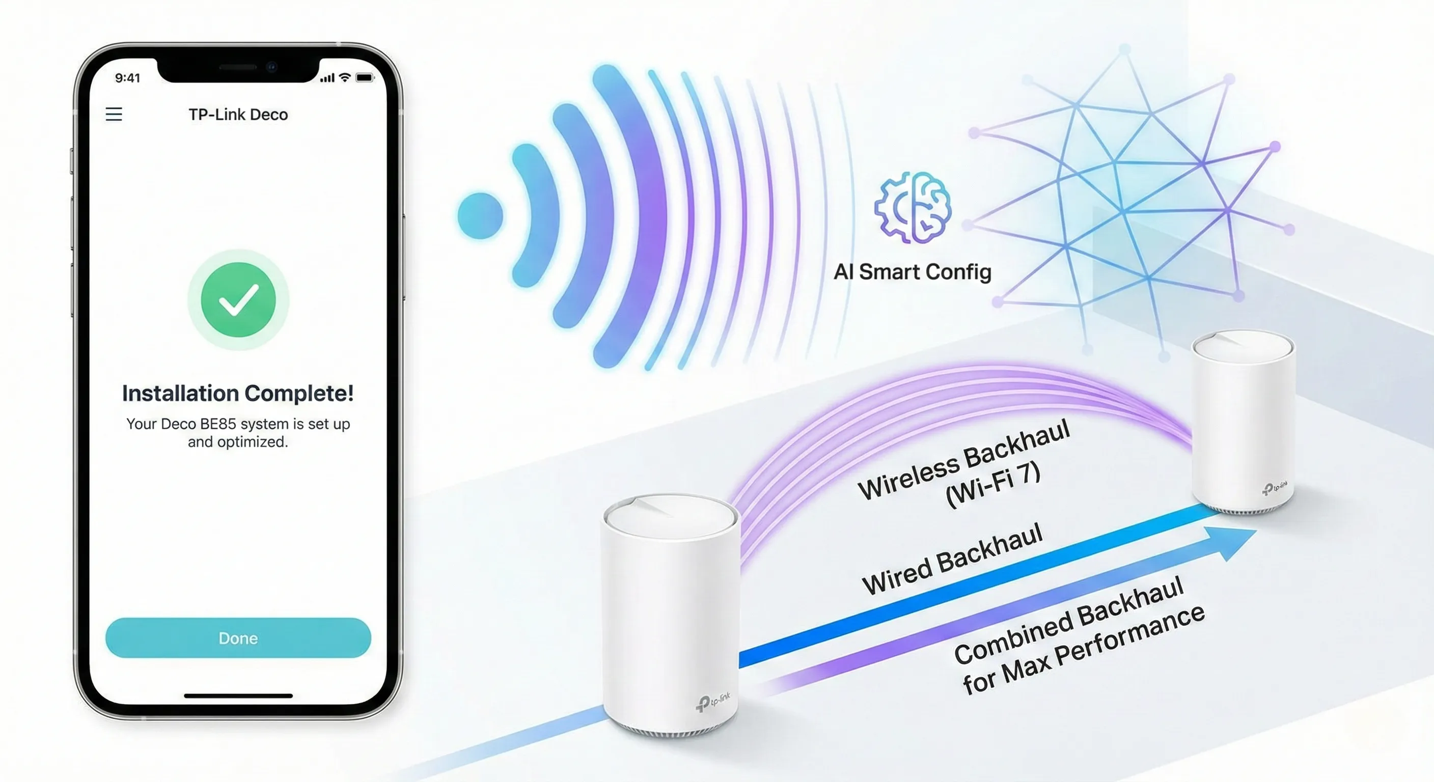 The Deco BE85 system simplifies network deployment with AI auto-detection via the Deco app and Bluetooth, streamlining the initial setup.