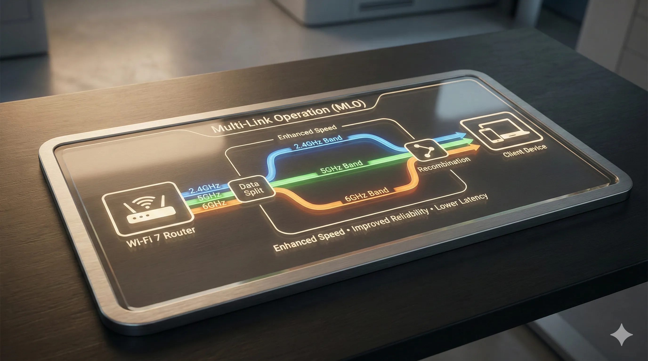 Multi-Link Operation (MLO) intelligently manages this traffic, prioritizing latency-sensitive applications like cloud gaming, AR streams, and real-time collaboration.