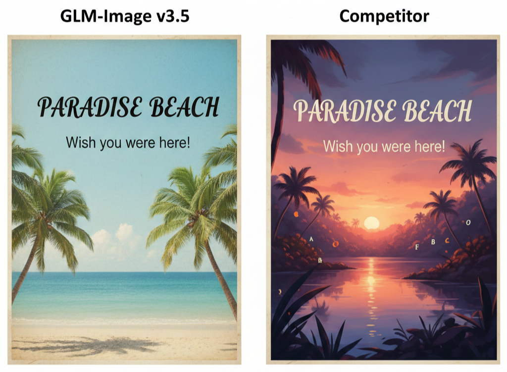 [IMAGE: A side-by-side comparison of an image generated by GLM-Image v3.5 (perfect text, slightly less aesthetic background) and a competitor (imperfect text, highly aesthetic background)]