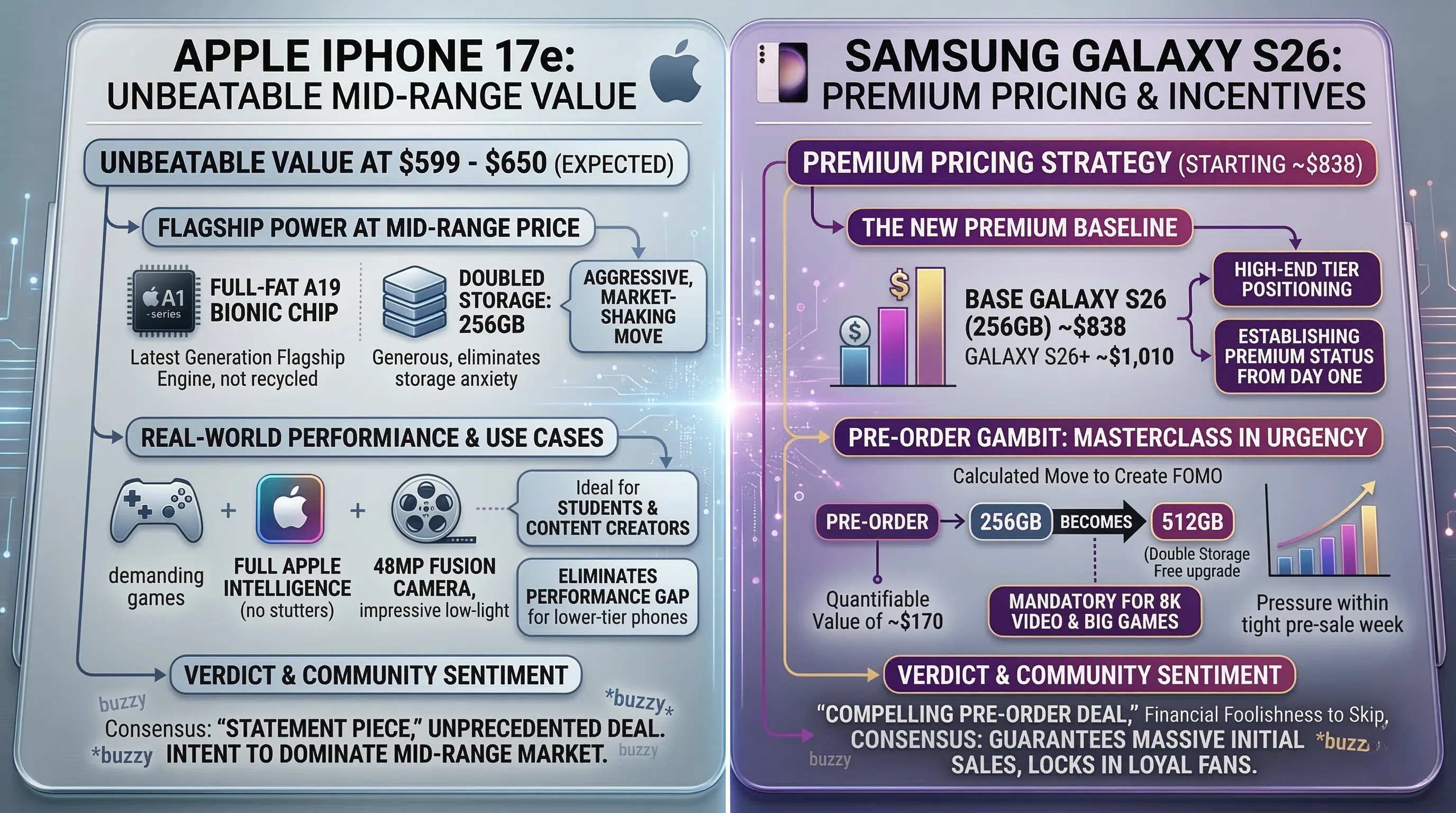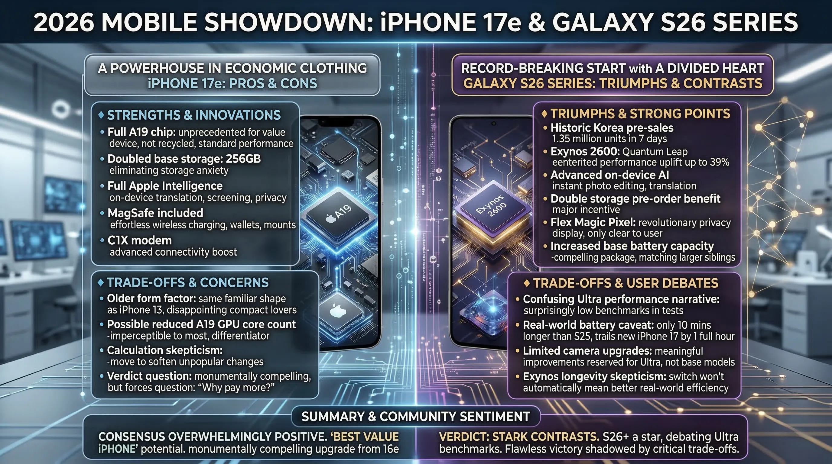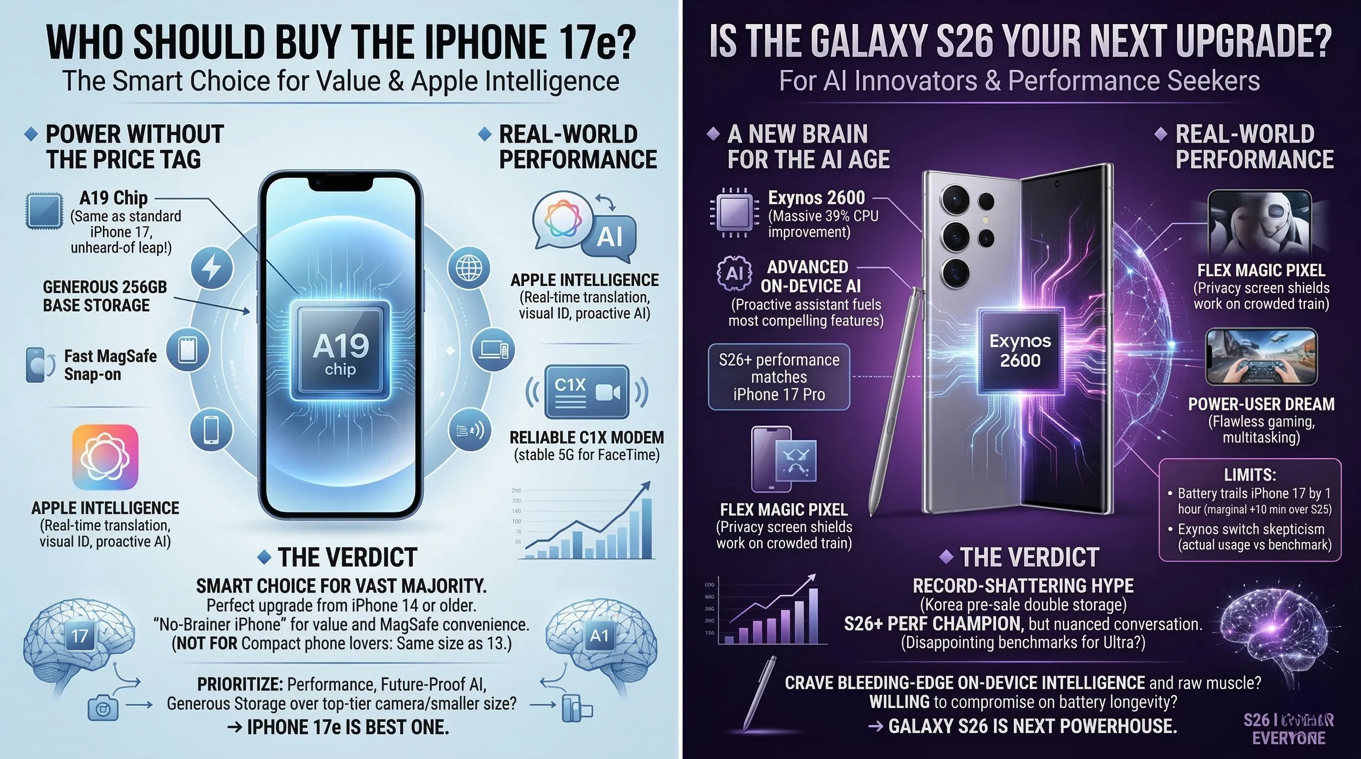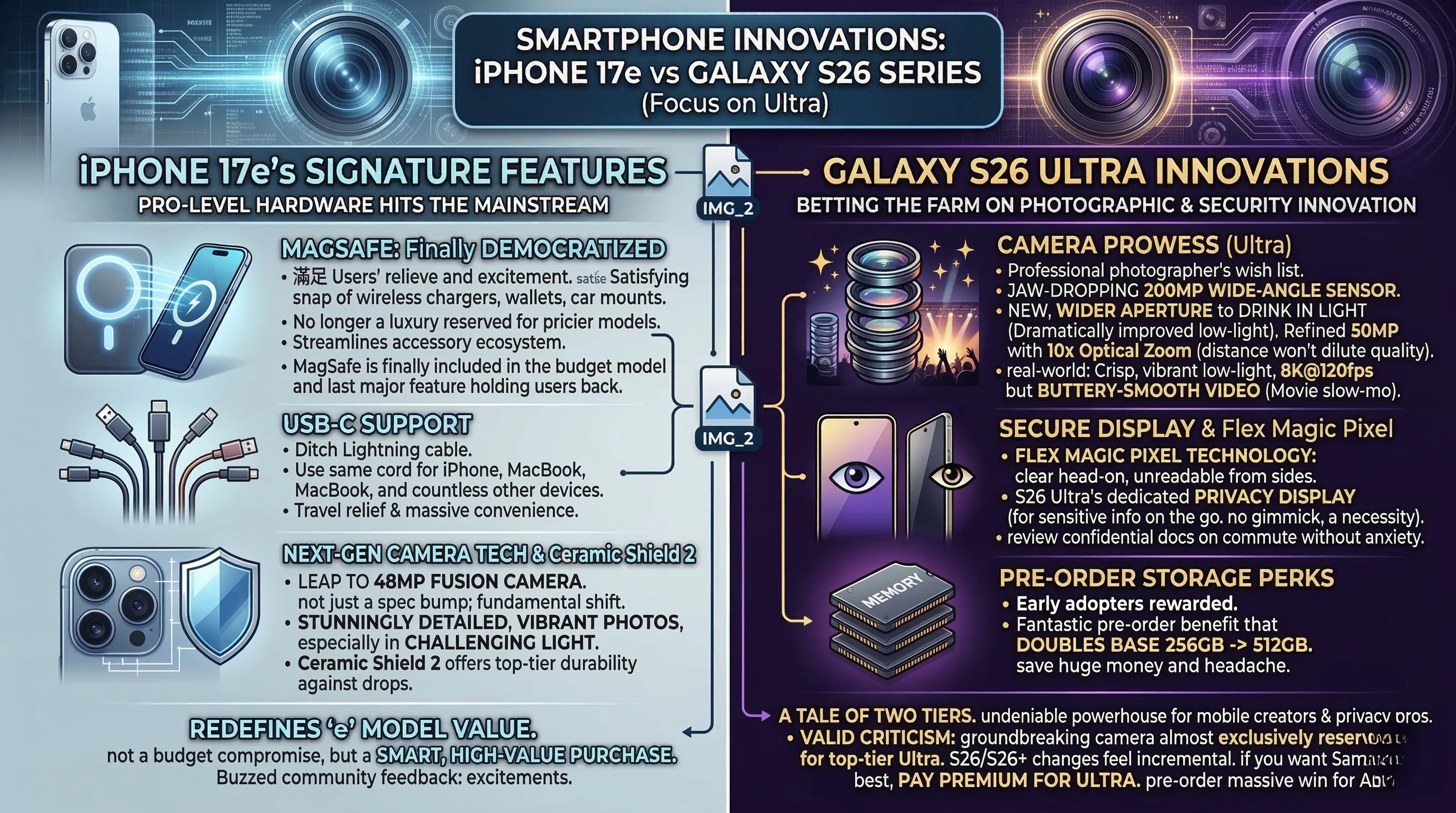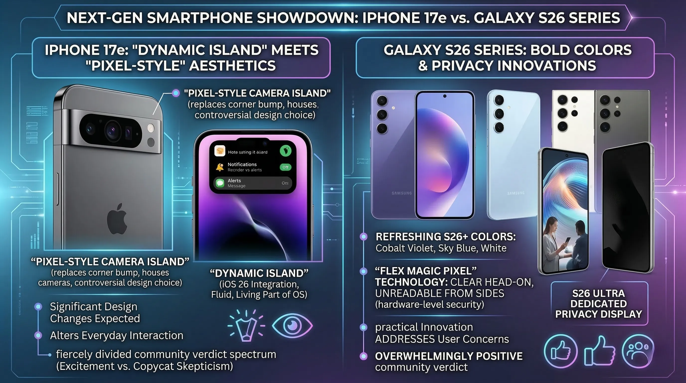 - While the iPhone 17e elevates its budget offering with premium features at a maintained price, the Galaxy S26 distinguishes itself with innovative security like Flex Magic Pixel and a compelling double storage upgrade for pre-orders.