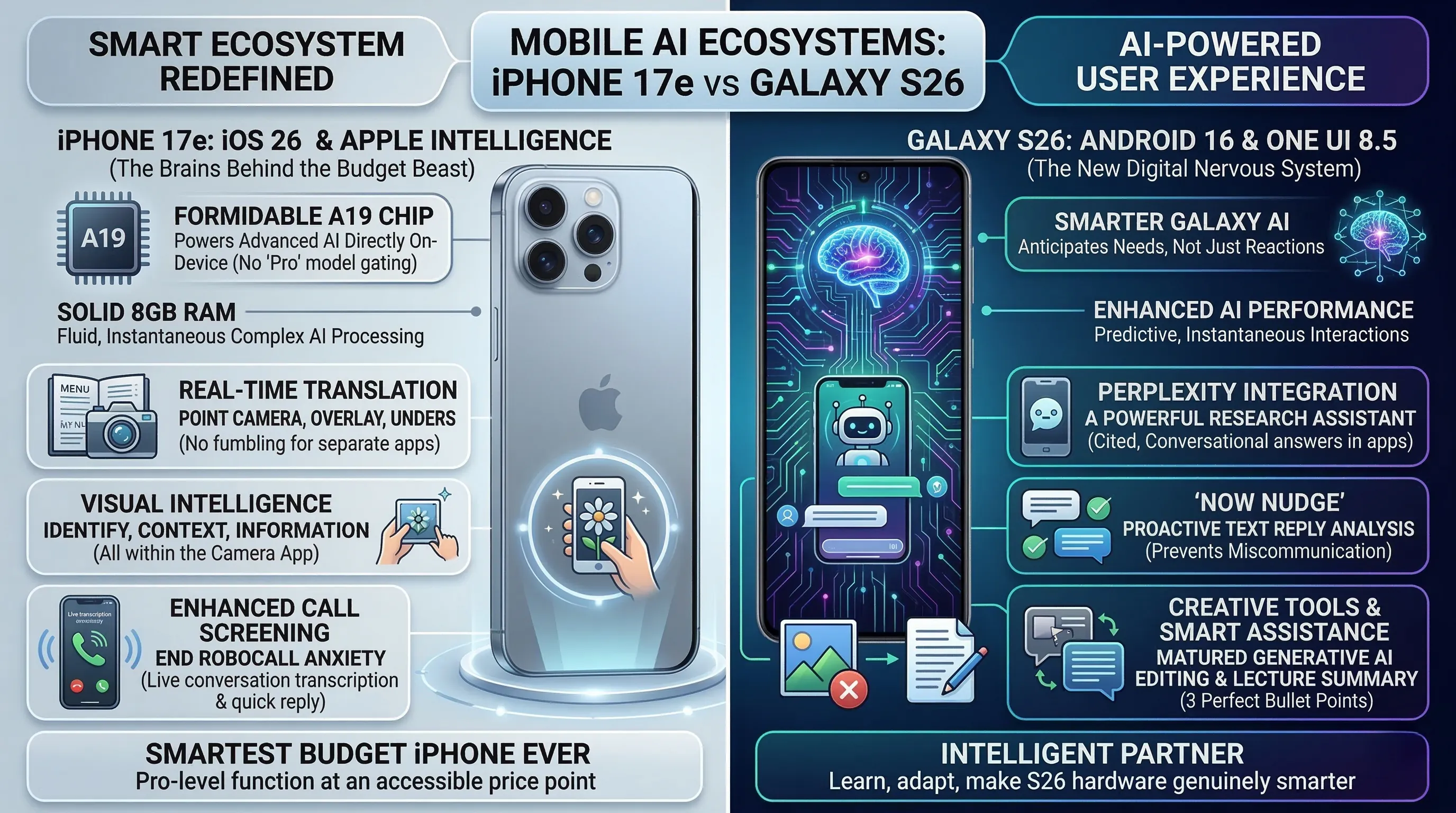 - Both tech giants are heavily investing in AI capabilities, with Apple Intelligence in the iPhone 17e bringing features like real-time translation, while Samsung's smarter Galaxy AI expands with tools like Perplexity and Now Nudge.